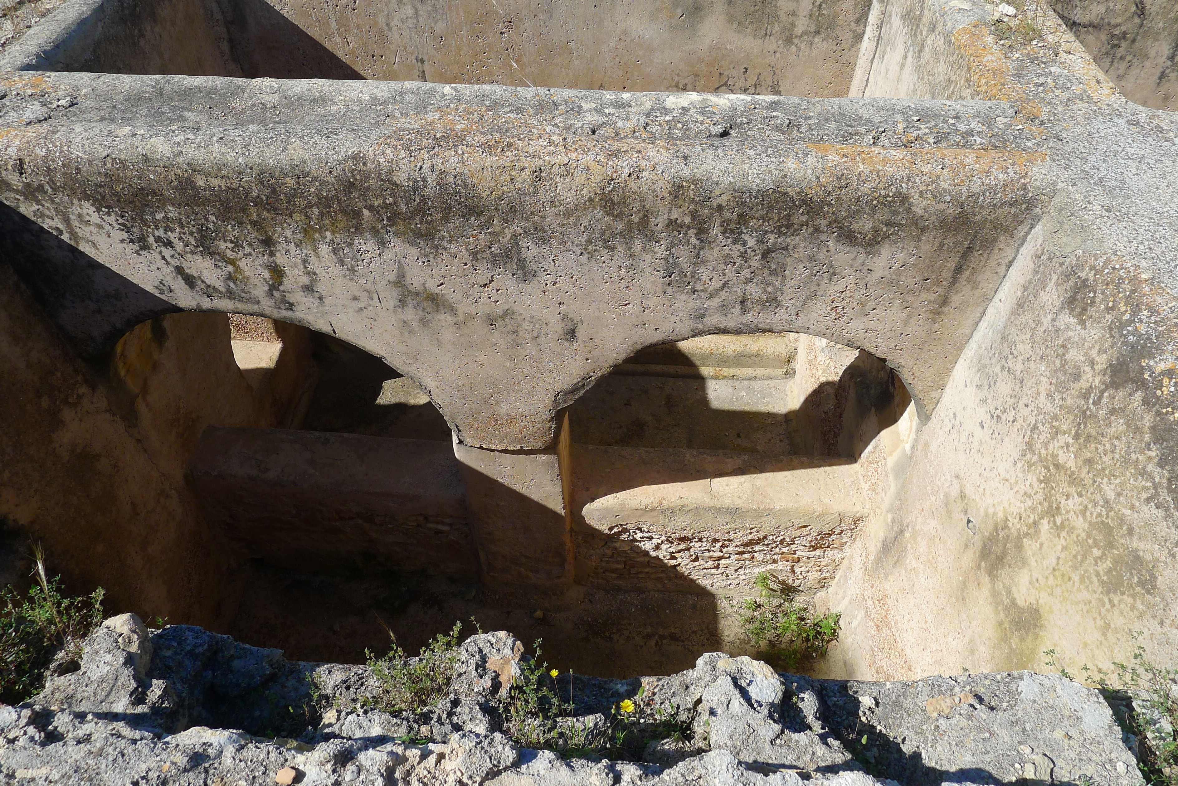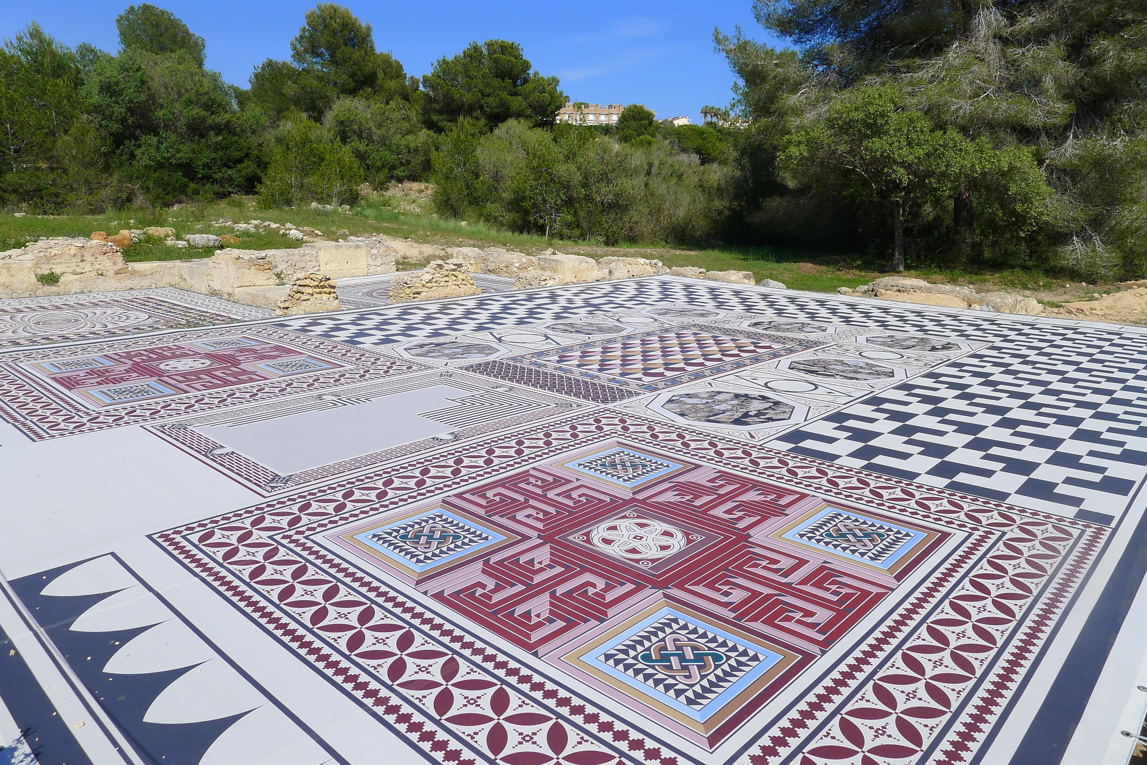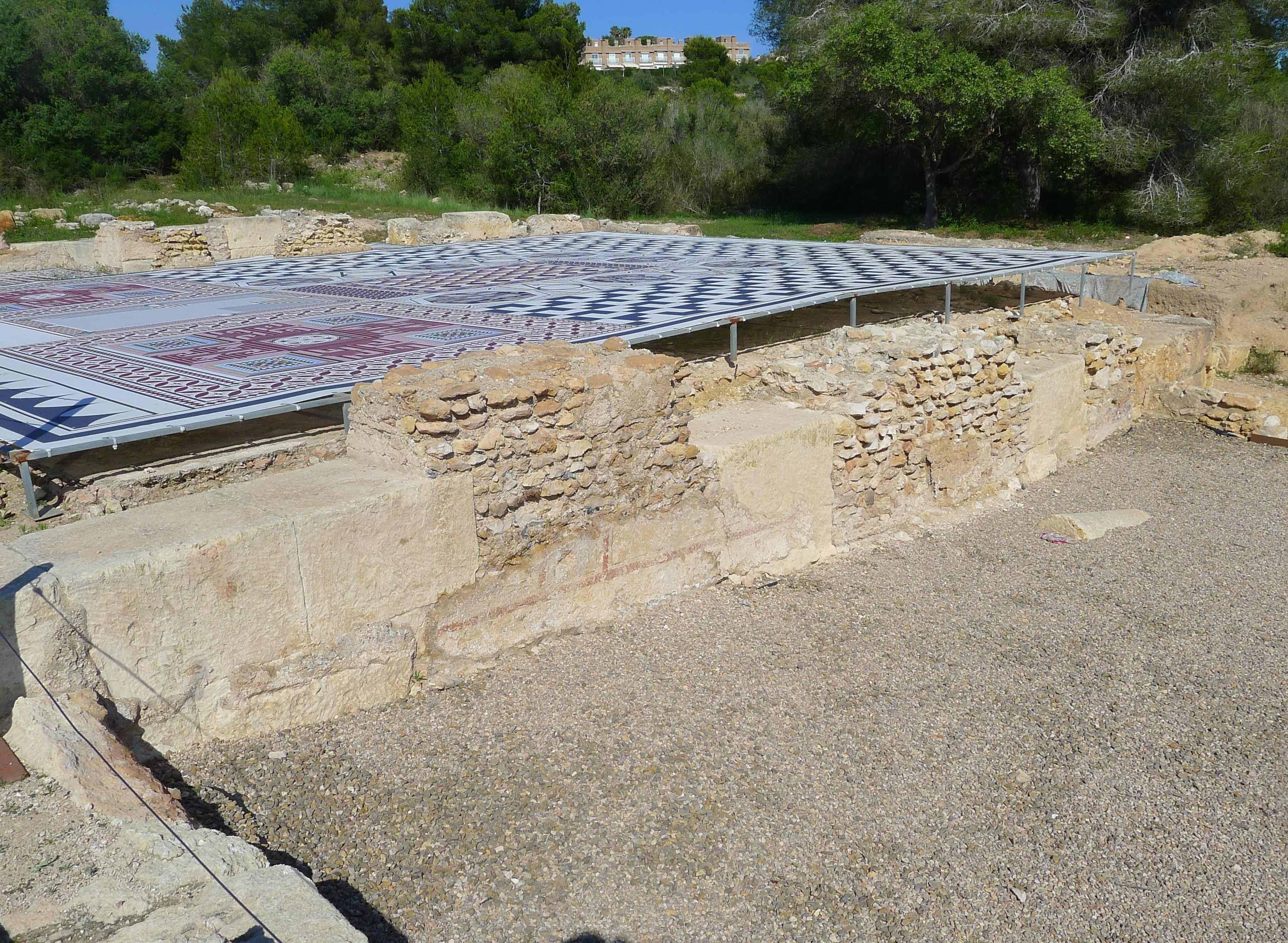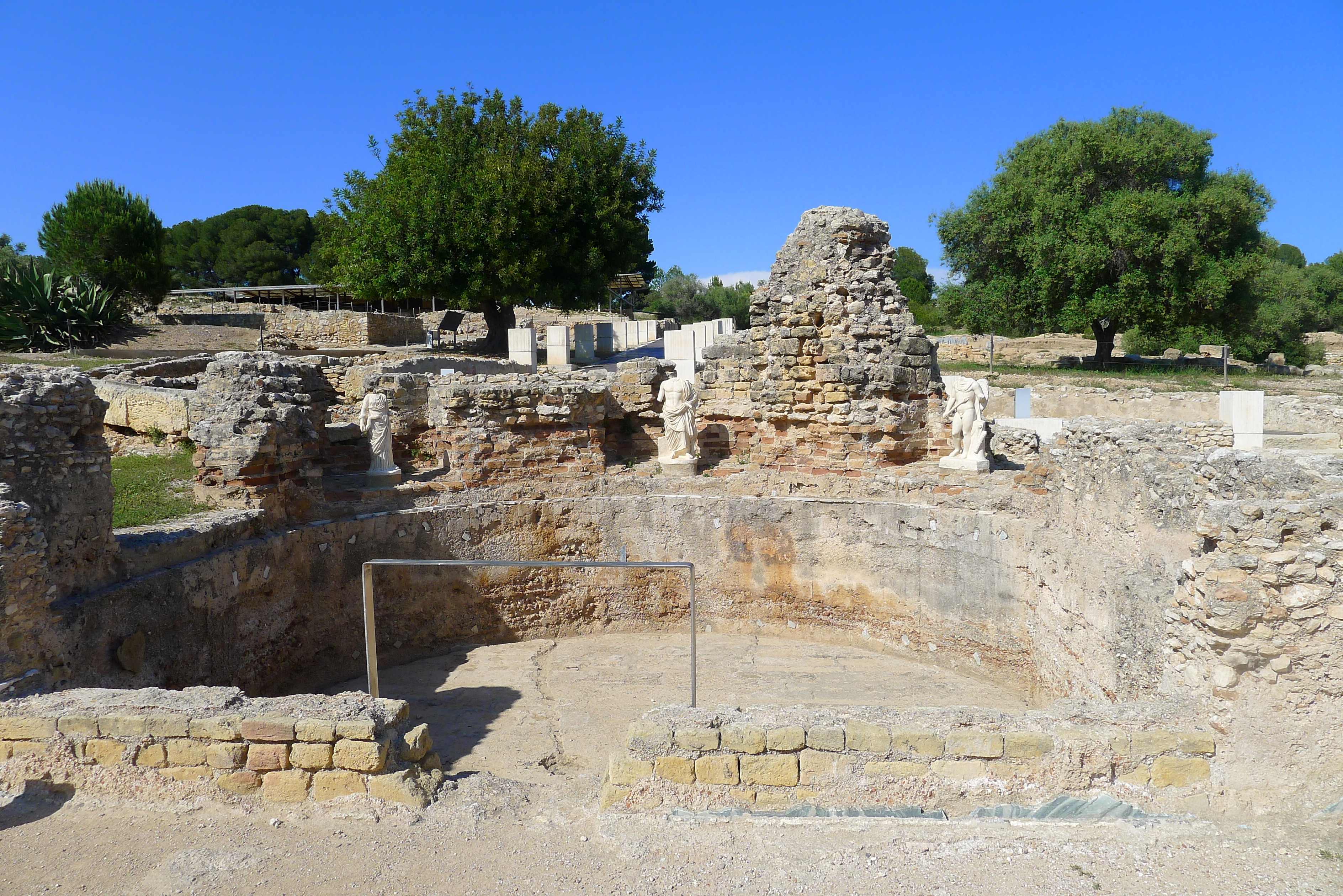 Després cal envoltar aquesta part central de la domus, passar pel que havia estat un peristil amb estany central, i arribar a la part més alta del turó, des d’on podem veure les estances de la domus per la part del darrera i diverses cisternes d’aigua. Una molt singular és la coneguda com a “Tartana” per la forma que té. Era un edifici amb volta de canó amb uns dipòsits al seu interior. I una mica més enllà, hi ha una altra cisterna d’aigua, soterrada, de gran capacitat, amb fins a vuit àmbits. Des d’aquest punt, hem de tornar enrere, per anar a buscar el que havia estat el corredor porticat que unia l’edifici principal amb les termes, situades en un angle del jardí. Al capdamunt del corredor hi ha el gran tricilini o menjador, on podem veure reproduccions dels mosaics del terra, i el mitreu.