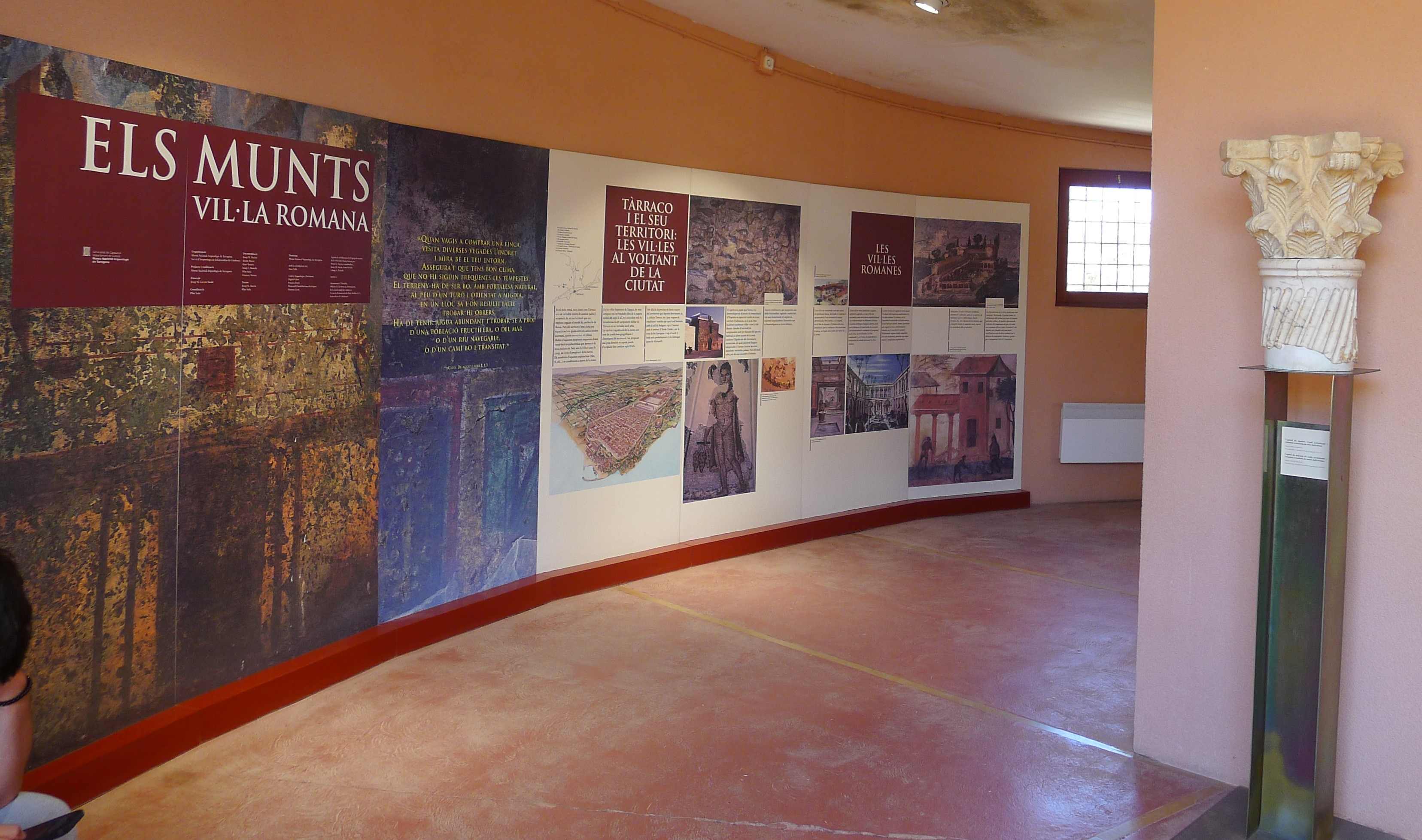 La visita a la vil·la comença amb una exposició on uns plafons ens posen la vil·la en context en l’entorn de Tàrraco i ens expliquen com era una vil·la romana tipus, on es posaven, quins edificis i espais tenien i després ens expliquen com era els Munts i la història de la vil·la i dels seus propietaris més destacats: el duumvir Caius Valerius Avitus i la seva esposa, Faustina. També hi ha vitrines amb alguns objectes que s’han trobat en les excavacions. Els plafons estan il·lustrats amb dibuixos i croquis que ens mostren com era la vil·la i la vida dels seus habitants i amb fotografies d’altres jaciments d’arreu de la mediterrània.