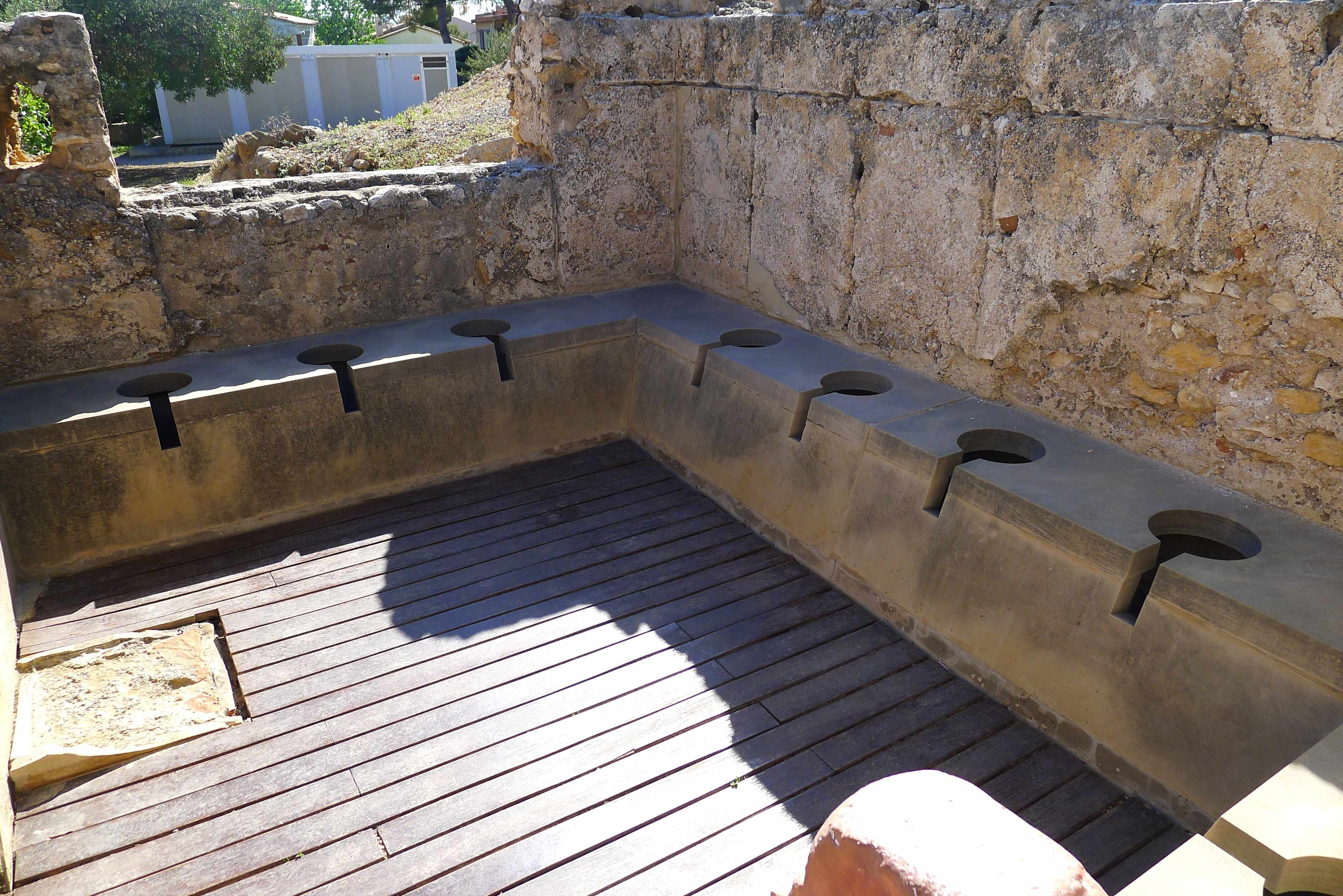 A la part de baix hi ha les termes, amb la part calenta i la freda, el forn on s’escalfava l’aigua que s’usava alhora per al bany i per a esclafar el paviment, ja que circulava sota el terra, i les latrines, on s’utilitzaven les aigües sobrants de les piscines i banyeres per evacuar els excrements. Hi podem veure una de les piscines amb tres estàtues i restes de pintura en alguns dels trams de parets que queden. En aquests banys hi havia, també, una sala de recepció on s’iniciaven i s’acabaven els banys i que estava decorada amb sumptuositat.