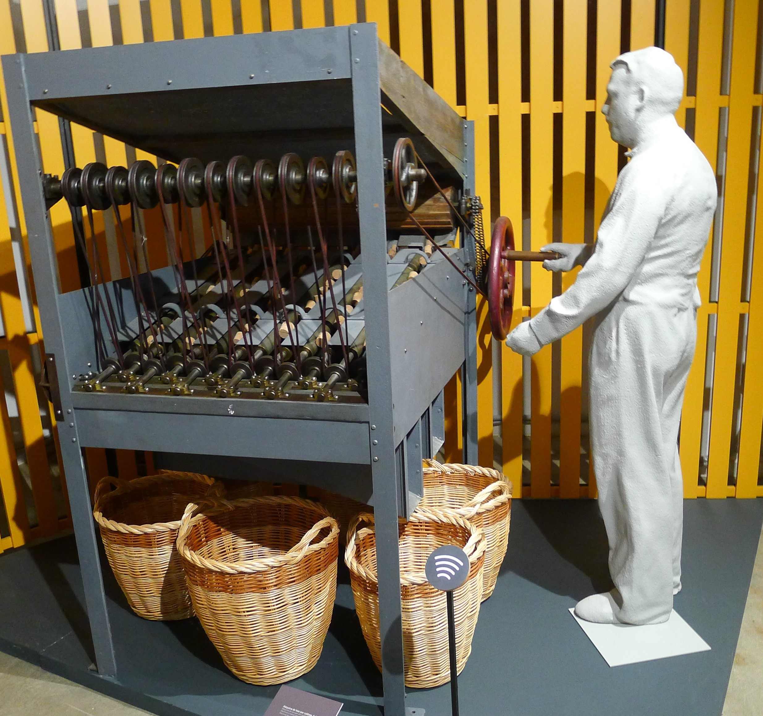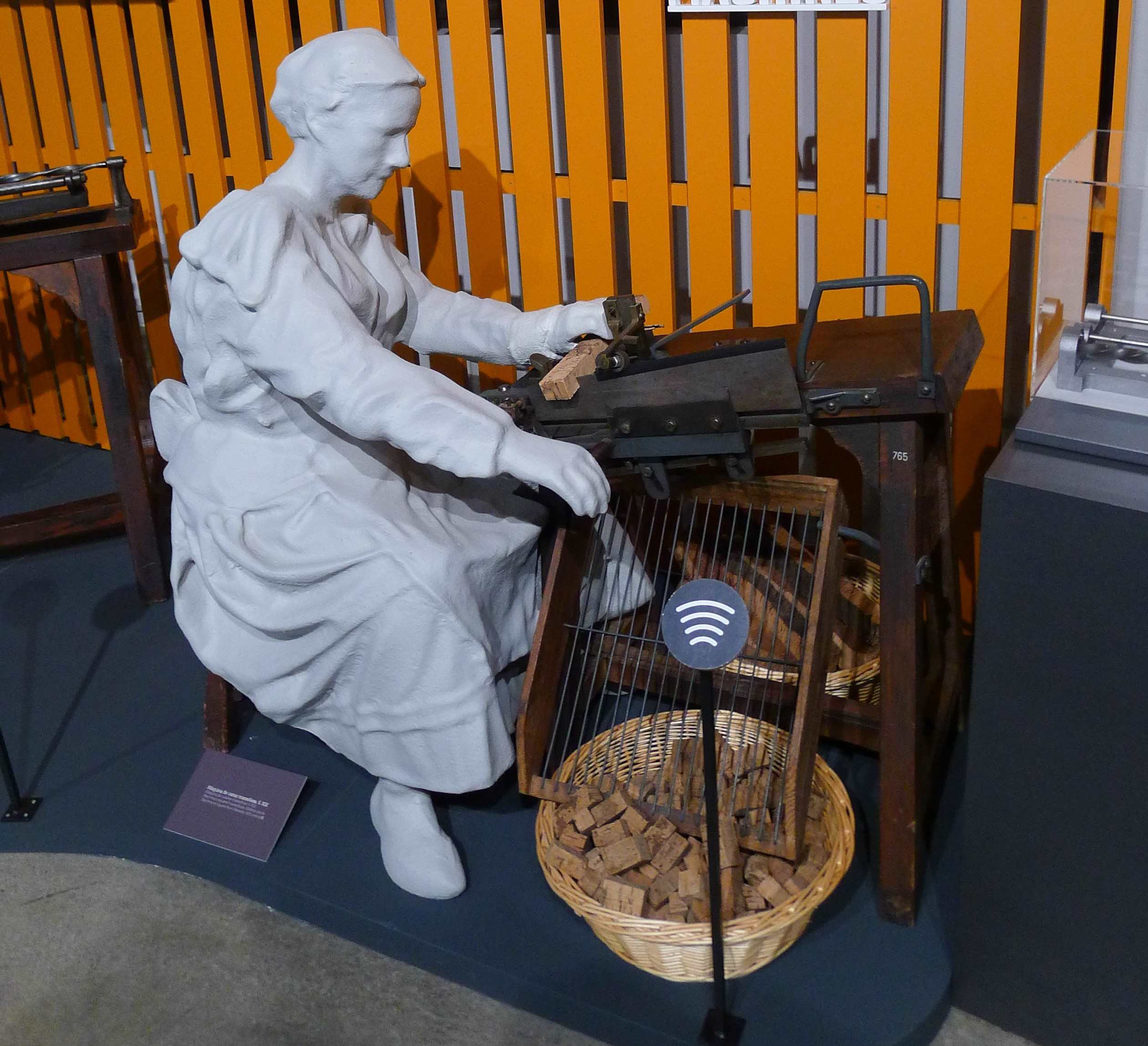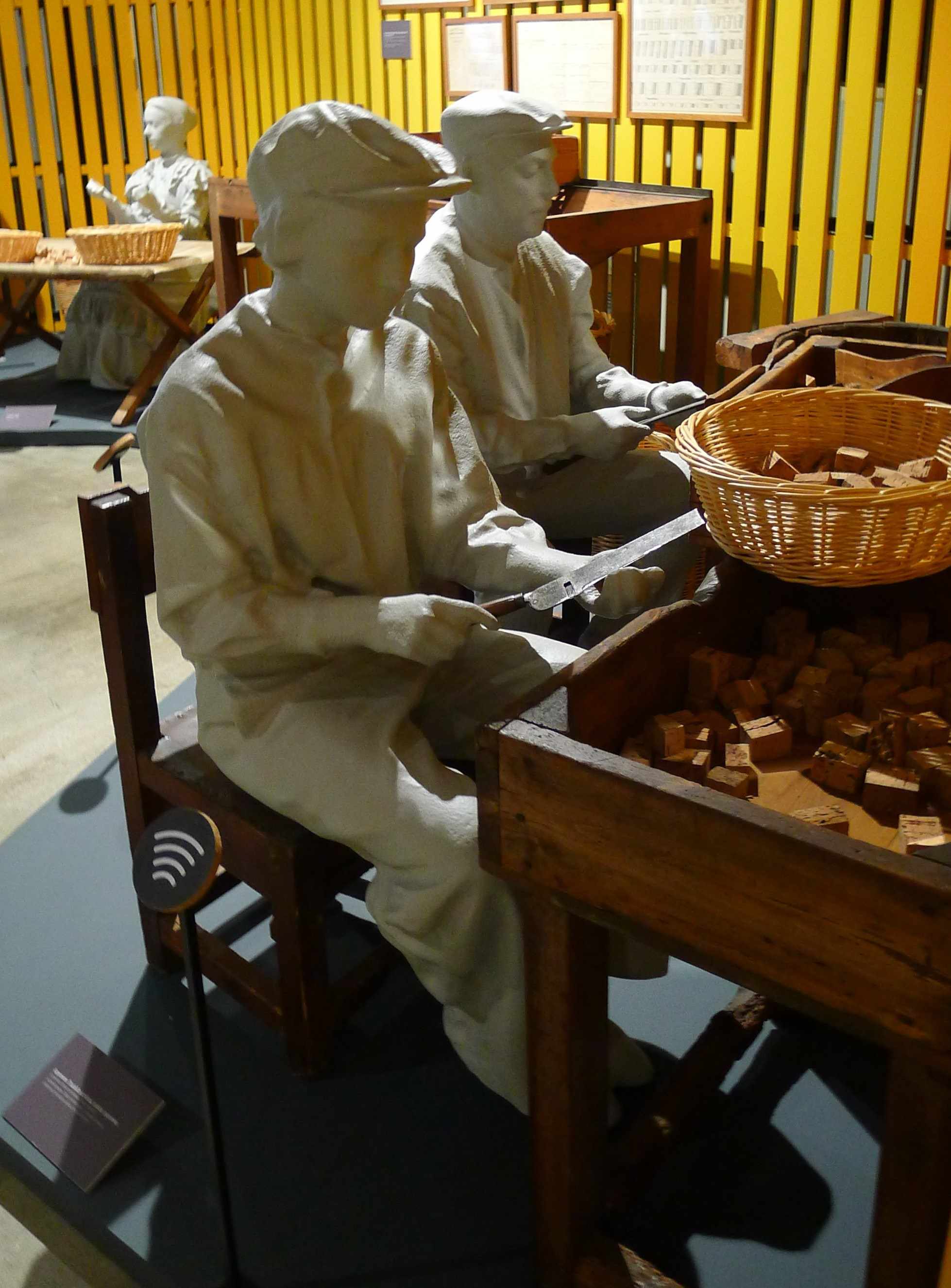 Una de les coses que pot sorprendre és el nombre de figures femenines que il·lustren les feines que es feien a la fàbrica, i això és perquè aquest va ser un sector amb molta presència femenina. En aquesta mateixa planta del museu hi podem veure com eren un despatx de direcció i un d’enginyeria. A més de mobles d’oficina d’època, hi ha exposada una centraleta telefònica de l’any 1960. També hi ha maquinaria elèctrica, més potent, altres objectes fets amb suro, més enllà dels taps, alguns dels quals ja els hem vist a la planta de baix. També hi ha una mostra de quadres, retaules i objectes artístics fets amb suro.
