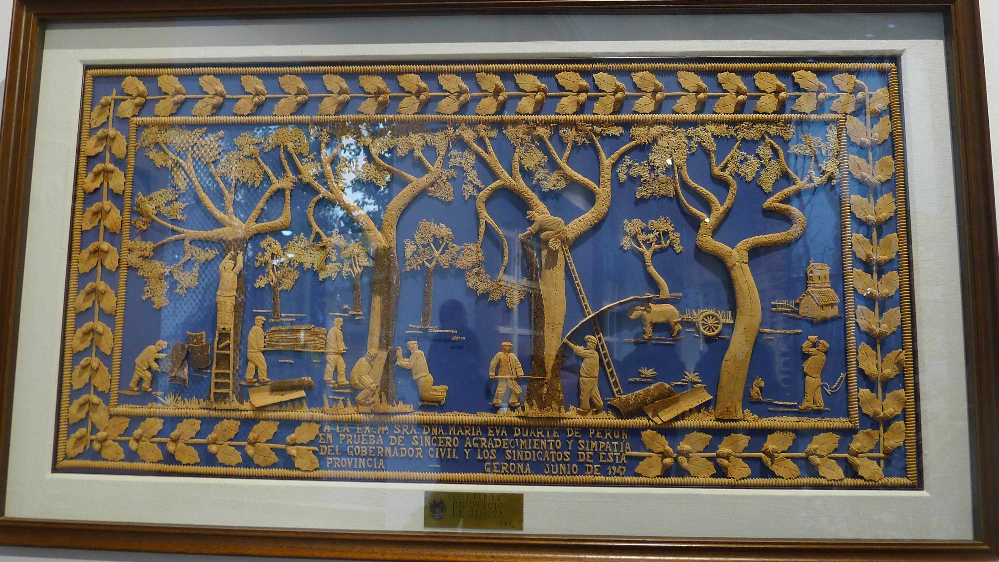També es pot veure una curiositat: un quadre que és un relleu, fet amb suro, que representa el treball al bosc i que es va fer com a obsequi de la Diputació de Girona a Eva Duarte de Perón en el viatge que va fer a Espanya l’any 1942, però que no se li va arribar a donar.