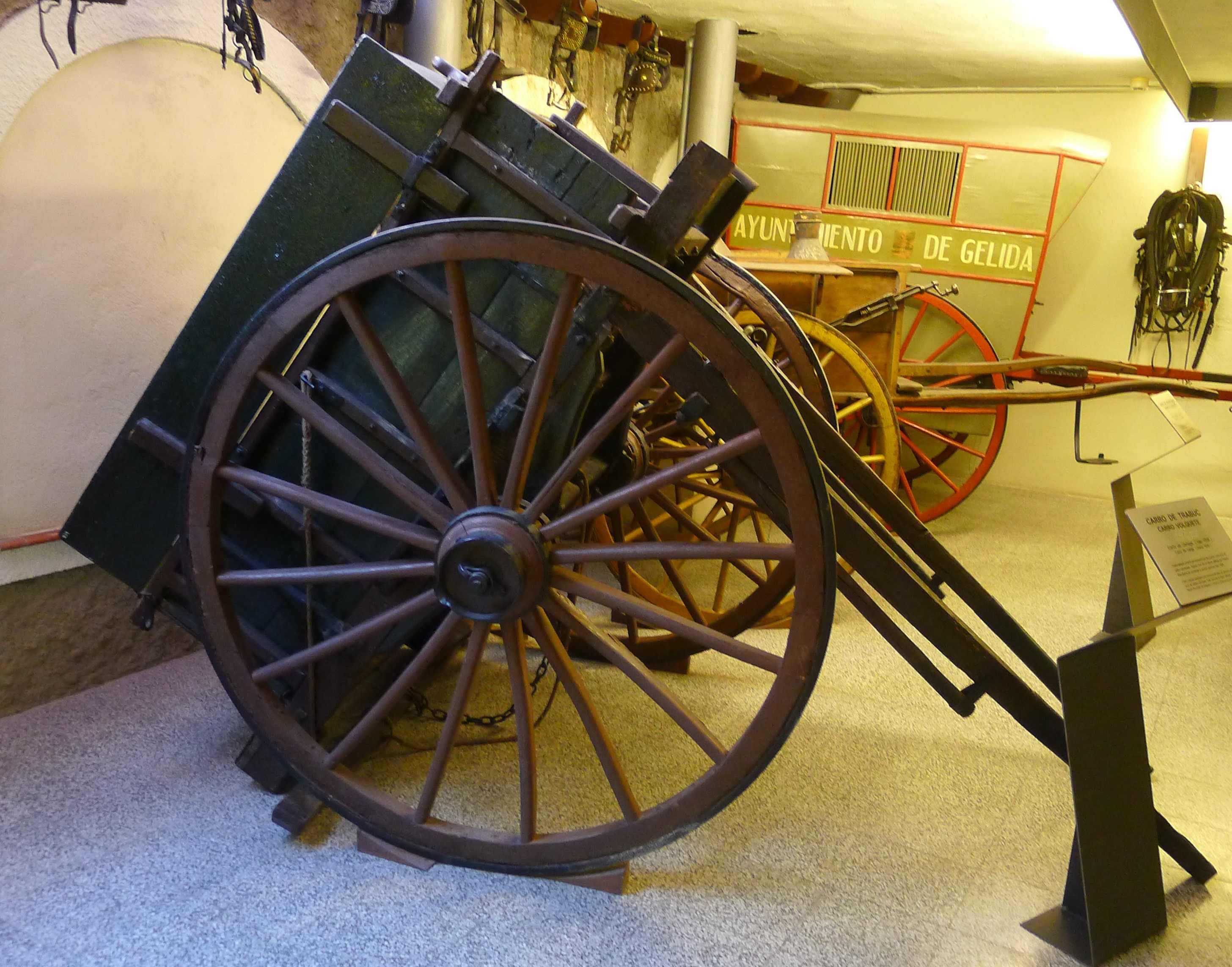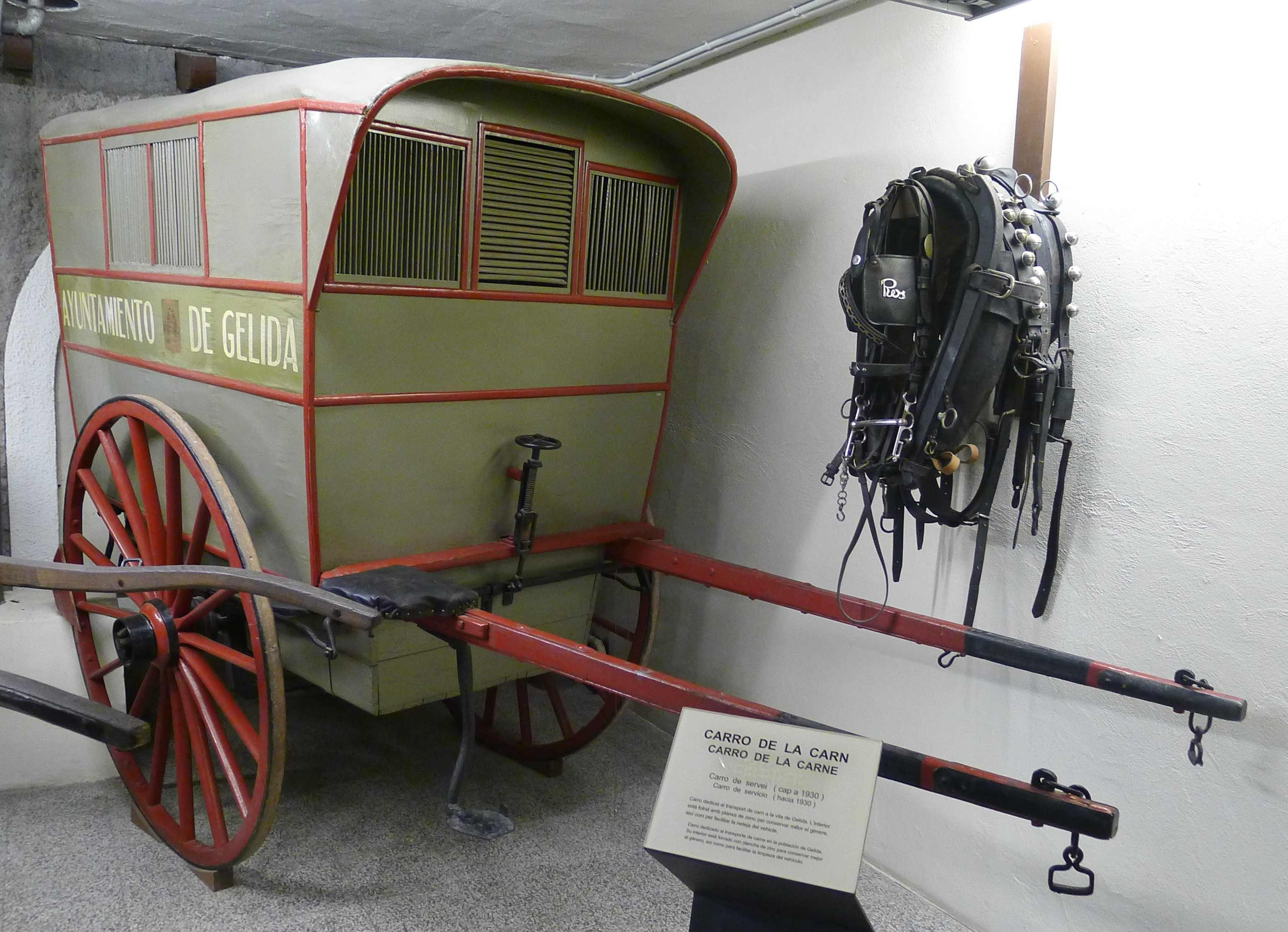 Una altra sala del primer pis està dedicada als carros de servei. Només entrar-hi podem veure un carret adaptat per ser tirat per un poni i que feia servir un metge rural amb discapacitat motriu. També hi ha tartanes, una de les quals amb un cavall dissecat; una tartana de luxe; un carro de bous; un carro de l’Ajuntament de Gelida, de la dècada de 1930, utilitzat per transportar carn; un carro de bots de principi del segle XX,utilitzat per transportar vi; o un carro de trabuc, un bolquet de la primera meitat del segle XX, que s’utilitzava per dur pedres i runa i que va fer servir Antoni Ros fins que va començar a conduir camions a la dècada de 1960. Al centre de la sala hi ha un carro molt singular, molt decorat amb pintures i amb fusta esculpida.