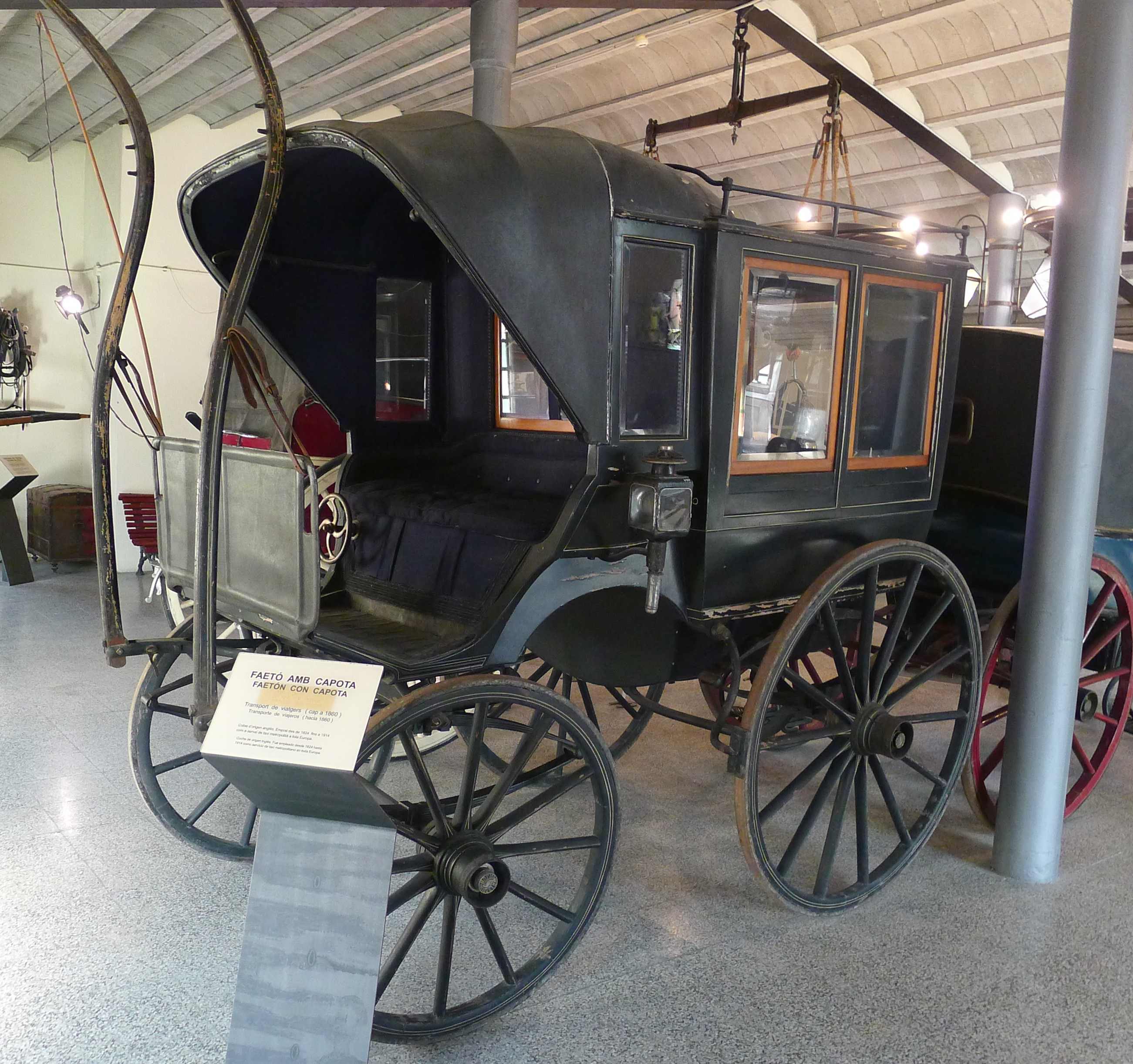 Vistos la llegenda de sant Antoni, la tradició dels Tres Tombs i qui va ser el creador de la col·lecció que mostra el Museu del Traginer, anem per veure què ens explica aquest museu i com ho fa. Comencem per veure la definició de “traginer”, segons el Diccionari de l’IEC: “Persona que tenia per ofici traginar mercaderies mitjançant una haveria o bèstia de càrrega. I quina és la definició de traginar: “Transportar (mercaderies) d’un lloc a un altre, especialment una persona, a braç o a l’esquena o per mitjà d’un animal”. El museu centra el seu relat en l’evolució del transport amb energies de sang, més o menys al llarg d’un segle, entre la segona meitat del segle XIX i la primera meitat del segle XX. Un plafó del museu ens explica que es denomina “Transport amb energies de sang al transport de persones i mercaderies en carros i carruatges tirats bé per equins, sien aquests cavalls o mules, bé per bous”.