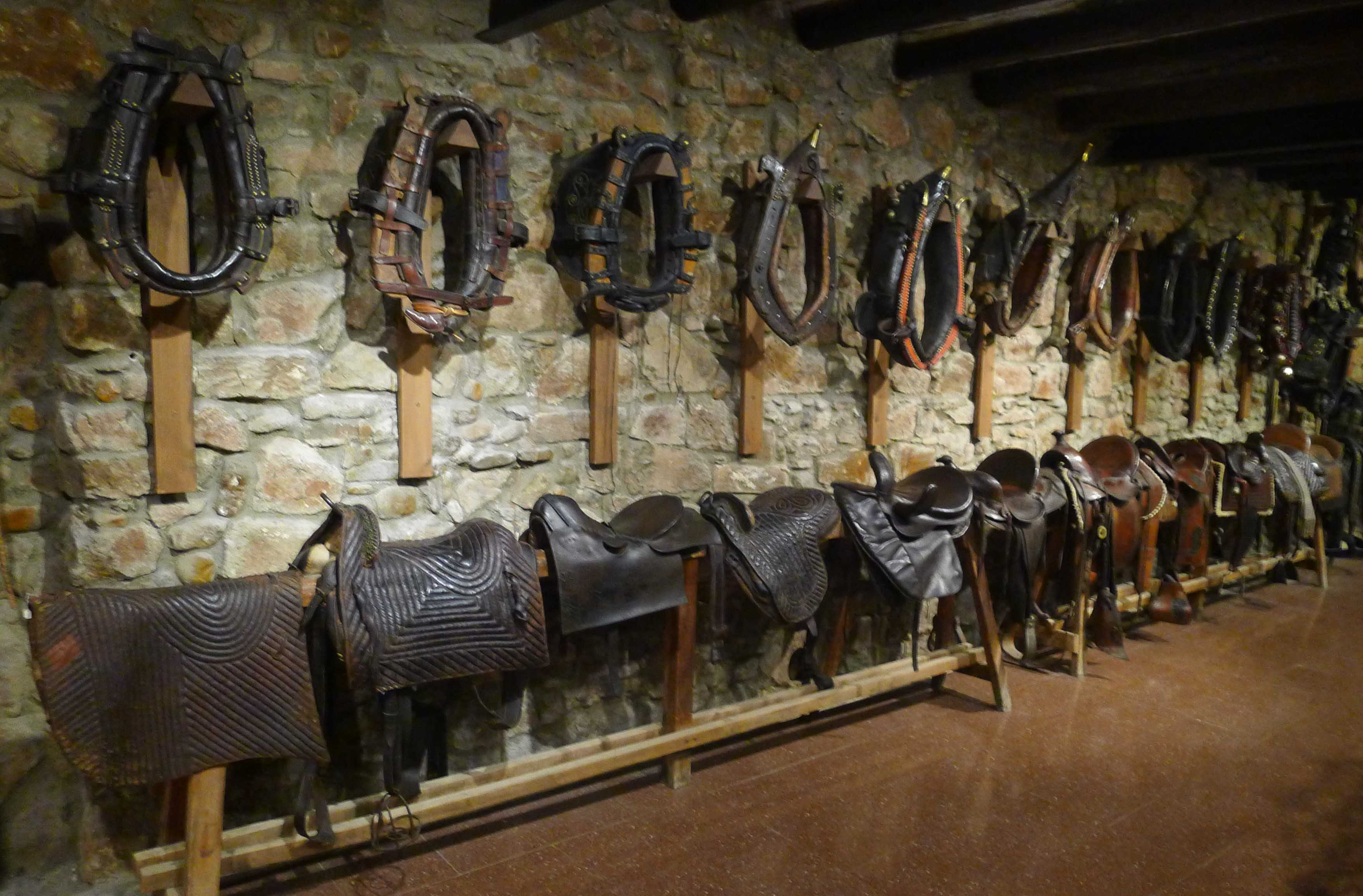 Al primer pis hi ha la sala de guarniments, on podem veure guarniments enflocats, brides i aplics, guarniments de treball, collars, bastets i selles. Destaquen una sella benestant, una sella militar dels entorns de 1714, una sella militar usada per oficials que va ser prohibida amb el decret de Nova Planta. També hi ha un selló de núvia del primer terç del segle XX i que s’usava als pobles de muntanya per dur la núvia fins a l’església el dia del casament. En algun cas també s’havia usat per dur persones grans. En un cantó hi ha un armariet amb miniatures de tota mena de carros i carruatges.