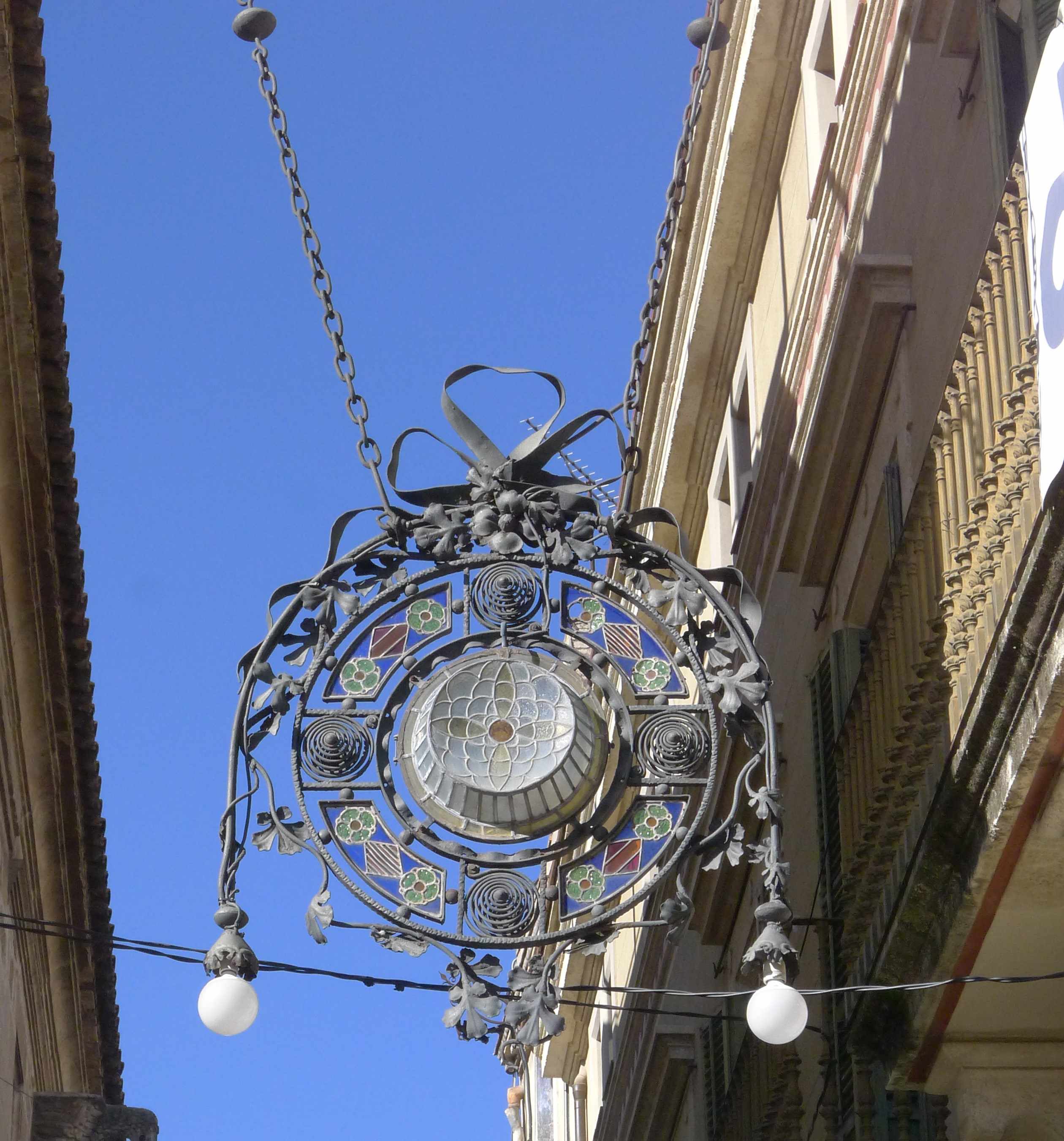 El carrer de la Cort, porticat a un cantó, ens porta fins a la plaça de la Vila que conflueix amb la plaça de Sant Joan. Com no podia ser d’altra manera, la plaça de la Vila està presidida per l’Ajuntament, un antic palau medieval que l’any 1559 va ser comprat per l’Ajuntament. Entre final del segle XIX i principi del XX l’arquitecte Eugeni Camplllonch el fa reformar i va fer l’actual façana modernista, on destaca, a la part superior dreta, un gran rellotge envoltat de garlandes. L’edifici de l’Ajuntament fa cantonada amb el carrer de Santa Maria, el qual, com el seu nom indica, porta cap a la basílica de Santa Maria. En aquest carrer hi ha tres fanals modernistes, un a cada punta i el tercer al mig, són de forma circular, estan fets amb ferro forjat, amb elements florals, i vidres policromats.