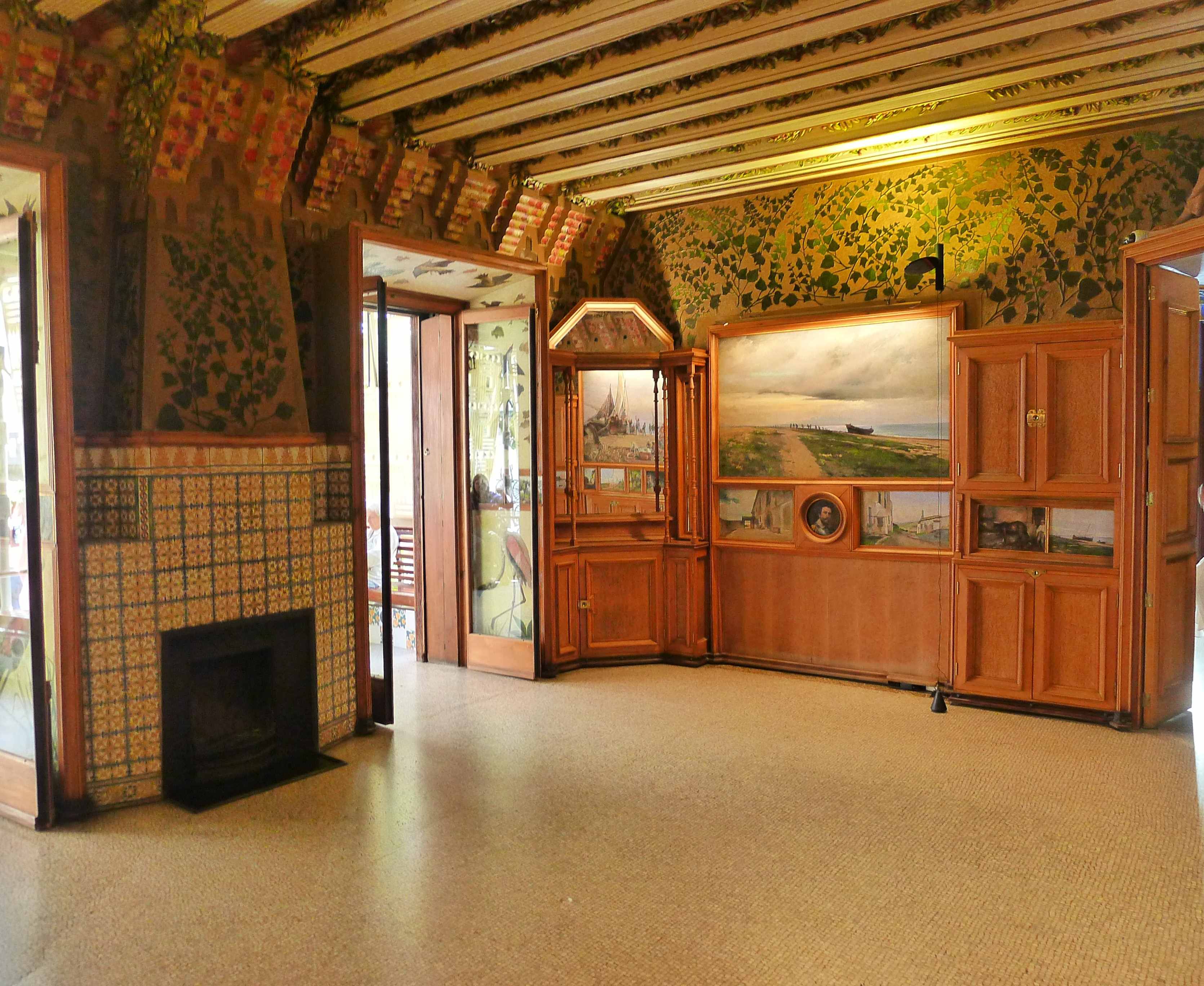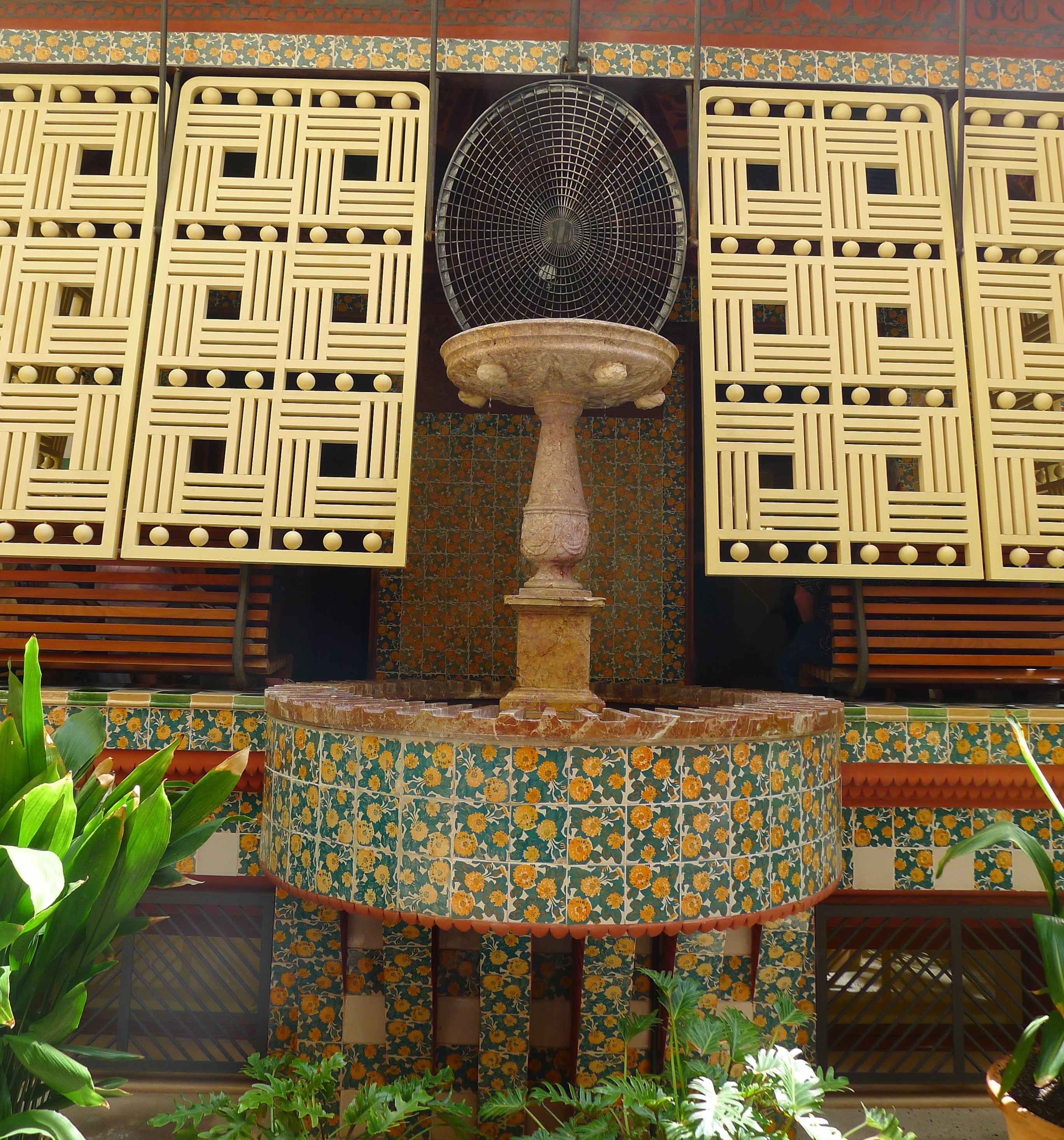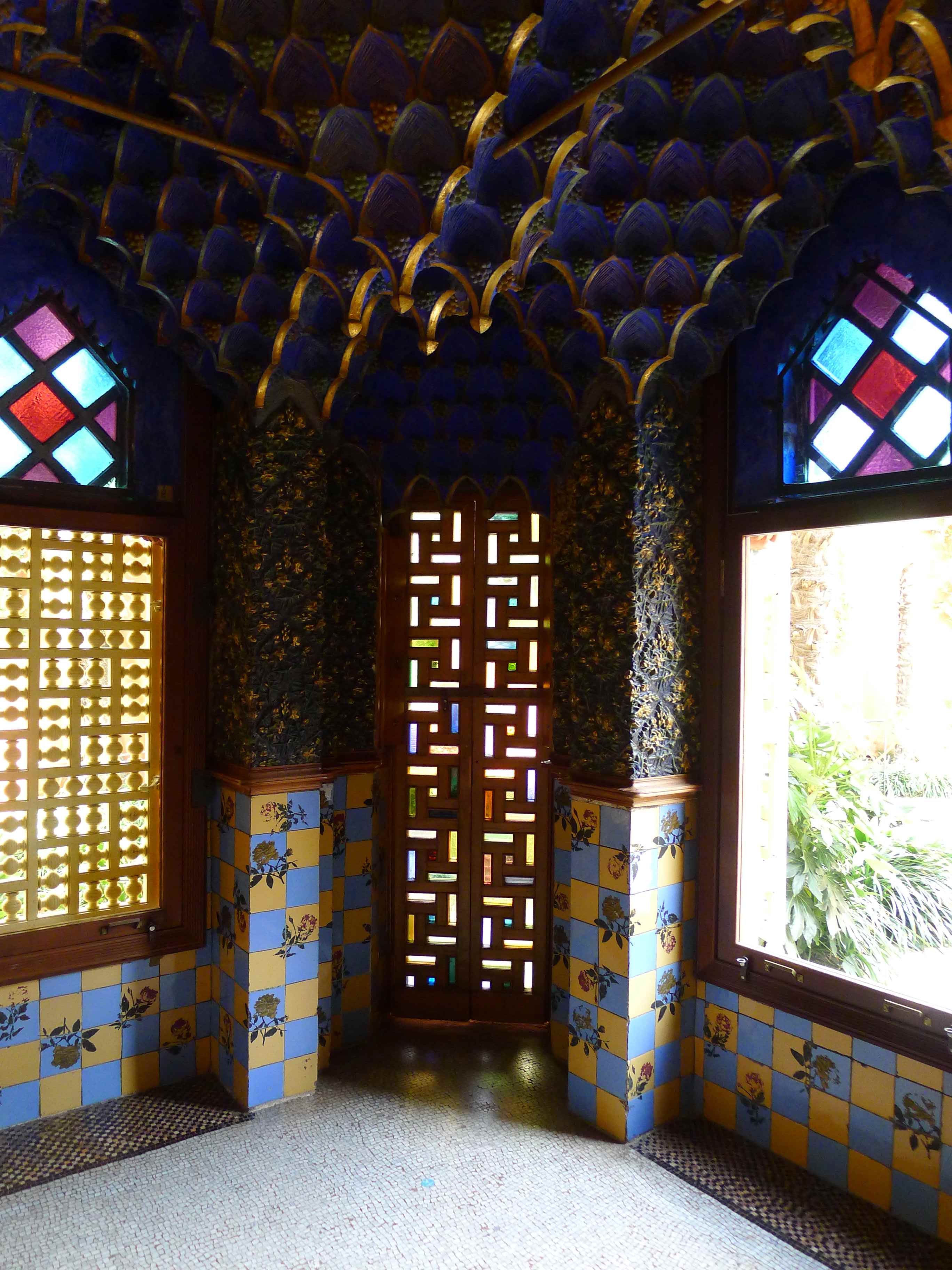 Continua Bergós: “En la cascada adoptà, per primera vegada, una ardida volta parabòlica. En la decoració apunta ja el lirisme naturalista de l’arquitecte: <<Quan vaig anar a prendre les mides del solar estava totalment cobert d’unes floretes grogues, que són les que vaig adoptar com a tema ornamental en la ceràmica>>. També hi trobà Gaudí una exuberant palmera margalló, les palmetes de la qual, foses en ferro, omplen la quadricula del reixat i de la porta d’entrada a la casa. A l’interior, llevat de la volta als fulls de rajola amb tirants i estalactites que cobreix el fumador i de l’enteixinat del saló, els sostres són de bigues de fusta sobre cartel·lats i l’entrebigat està decorat amb fullatges verds i brillants, espurnejats amb carrolls d’enceses cireres, del rioler sostres del menjador pengen diversos ocells corporis, mitjançant fils gairebé imperceptibles, i en els amples muntants de pas del menjador a la tribuna hi va fer pintar uns variats estols d’ocells volant. Davant la tribuna col·locà un brollador amb una teranyina de fils metàl·lics; l’aigua es dispersa en múltiples gotetes que, travessades pel sol, fan un màgic pampallugueig irisat”.