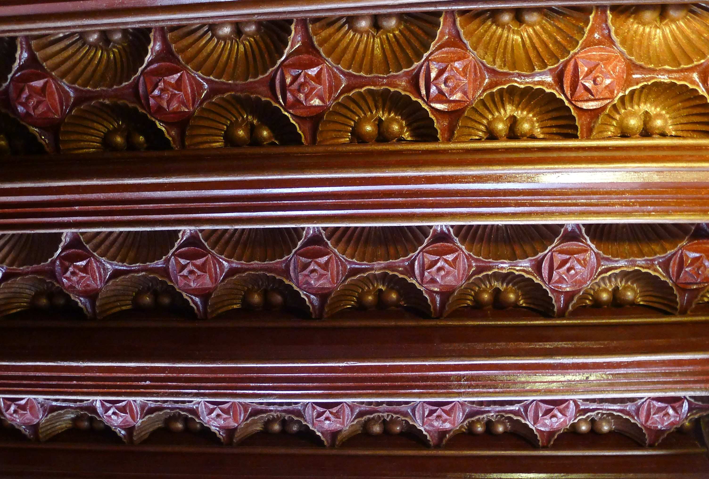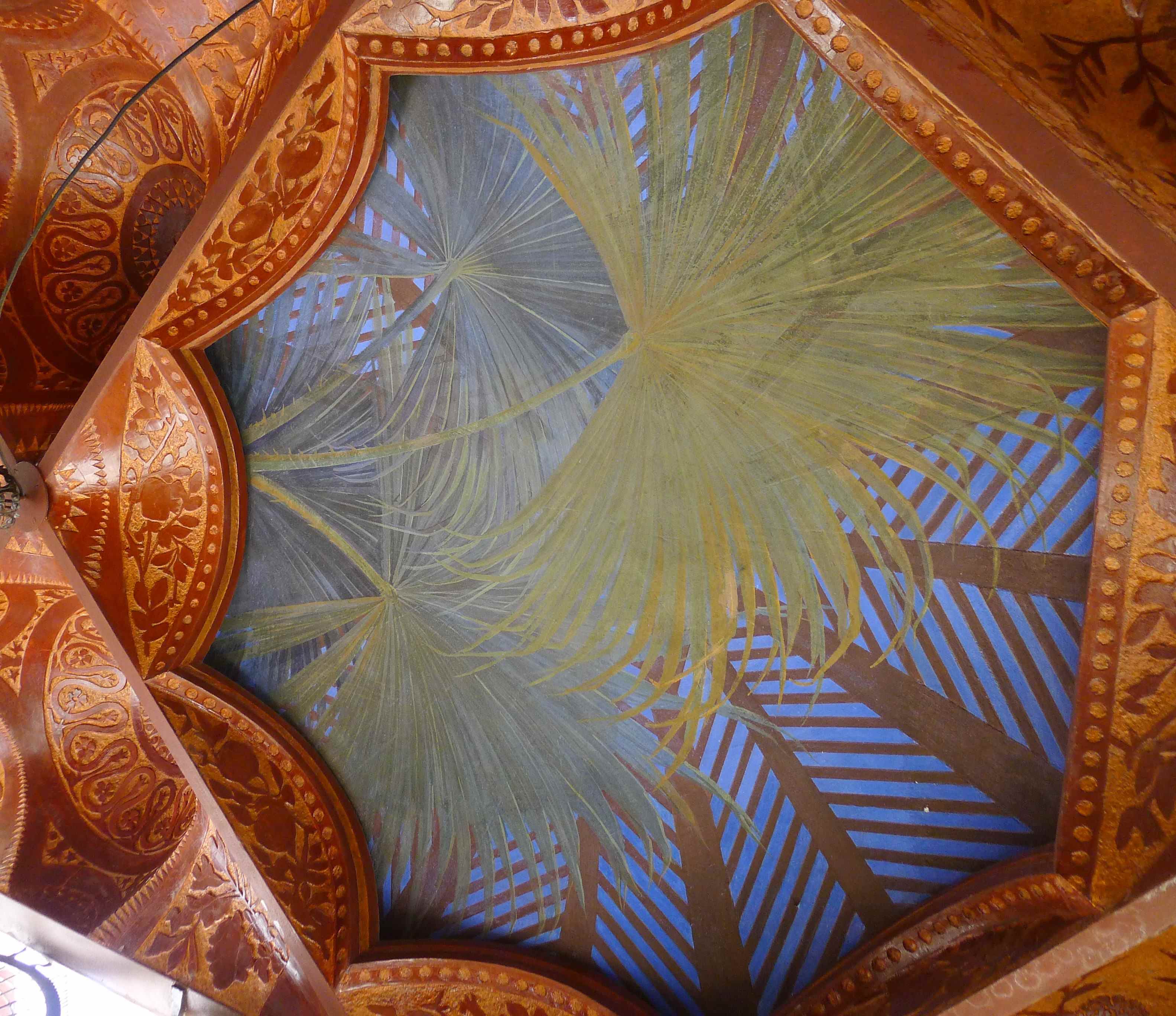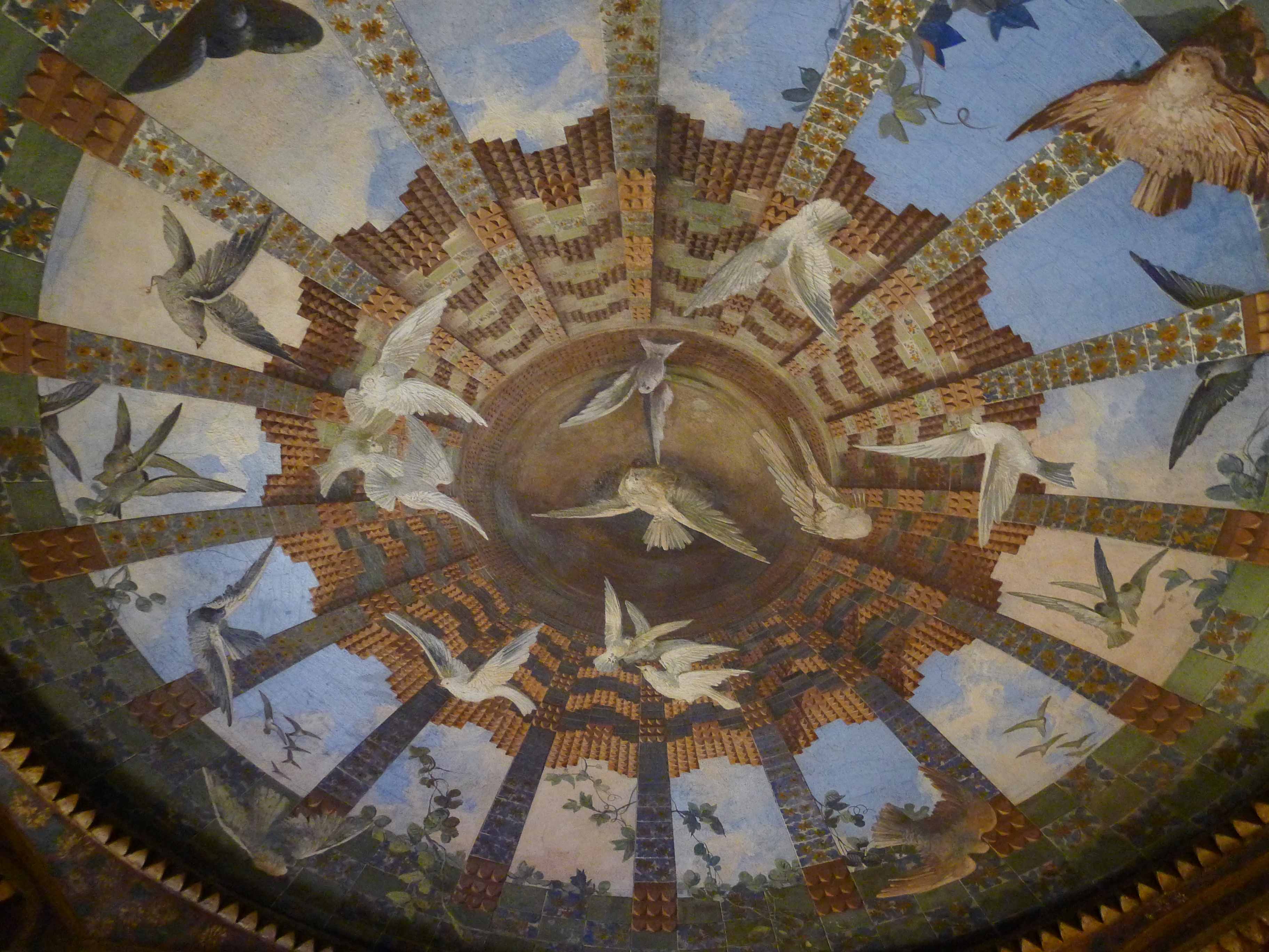 Continua Bergós: “En la cascada adoptà, per primera vegada, una ardida volta parabòlica. En la decoració apunta ja el lirisme naturalista de l’arquitecte: <<Quan vaig anar a prendre les mides del solar estava totalment cobert d’unes floretes grogues, que són les que vaig adoptar com a tema ornamental en la ceràmica>>. També hi trobà Gaudí una exuberant palmera margalló, les palmetes de la qual, foses en ferro, omplen la quadricula del reixat i de la porta d’entrada a la casa. A l’interior, llevat de la volta als fulls de rajola amb tirants i estalactites que cobreix el fumador i de l’enteixinat del saló, els sostres són de bigues de fusta sobre cartel·lats i l’entrebigat està decorat amb fullatges verds i brillants, espurnejats amb carrolls d’enceses cireres, del rioler sostres del menjador pengen diversos ocells corporis, mitjançant fils gairebé imperceptibles, i en els amples muntants de pas del menjador a la tribuna hi va fer pintar uns variats estols d’ocells volant. Davant la tribuna col·locà un brollador amb una teranyina de fils metàl·lics; l’aigua es dispersa en múltiples gotetes que, travessades pel sol, fan un màgic pampallugueig irisat”.