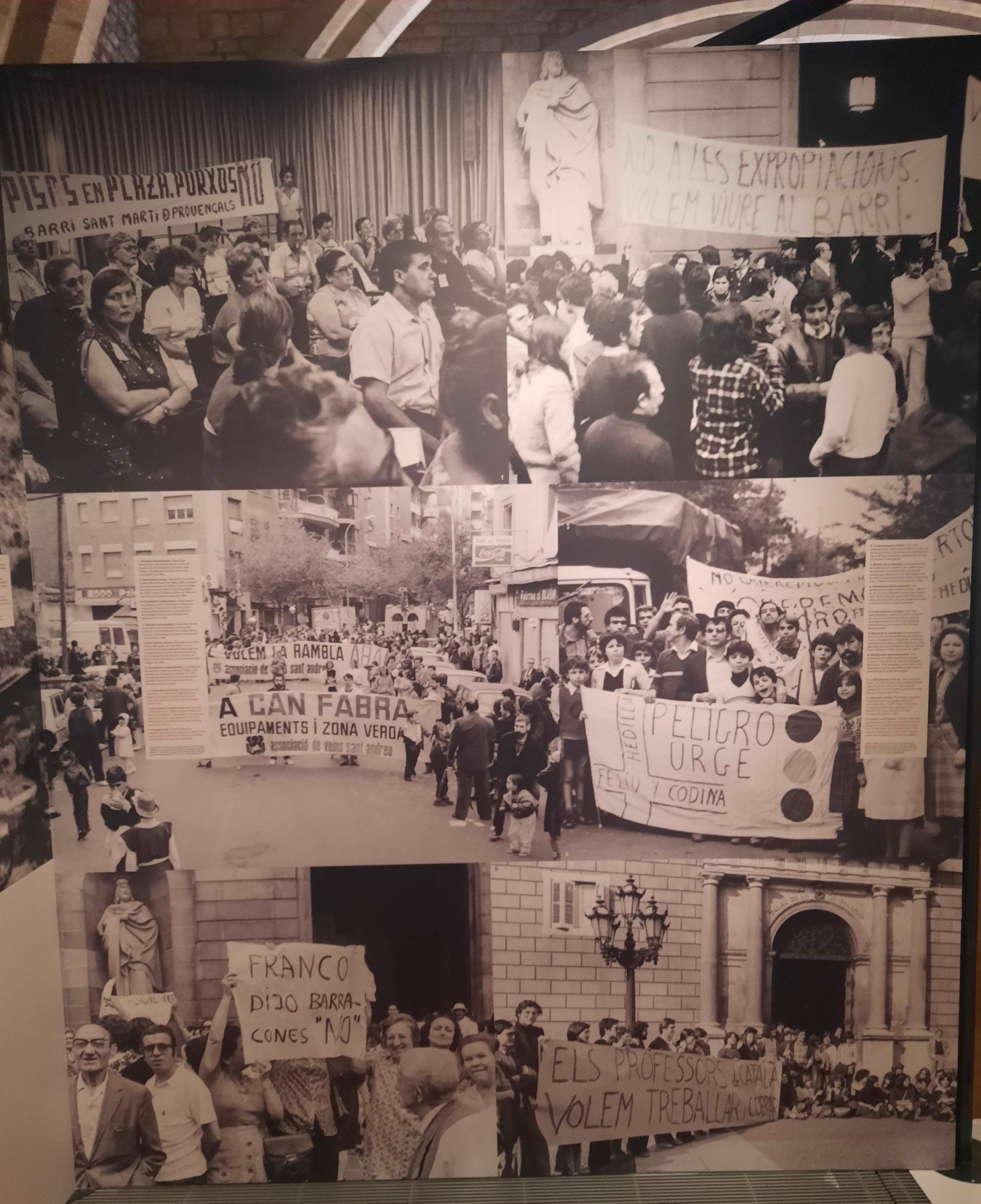 El darrer àmbit és La societat: formes de treball i diversitat social. S’hi poden veure un seguit de fotografies de manifestacions i concentracions reivindicatives, com una de l’època franquista en que es veu un grup de persones a la porta de l’Ajuntament amb cartells on hi ha escrit: “Franco dijo barracones NO”. Però també hi ha documents com la coberta del Llibre de privilegis i ordinacions dels sabaters, dels segles XIV – XVI, on s’hi pot veure la forma d’una sabata feta amb llautó clavada sobre la pell. També hi ha el Llibre de privilegis i ordinacions aprovades pel Consell de Cent l’any 1386 per regular les pastures als entorns de la ciutat per impedir que el bestiar fes malbé els conreus. Una altra peça interessant és una de les edicions manuscrites de mitjan segle XV del Llibre del Consolat de Mar de Barcelona. I també un llibre en que es recollien els divorcis dels anys 1932 – 1935, preparat a correcuita pels oficials municipals després de l’aprovació de la llei del divorcis, l’any 1932.
