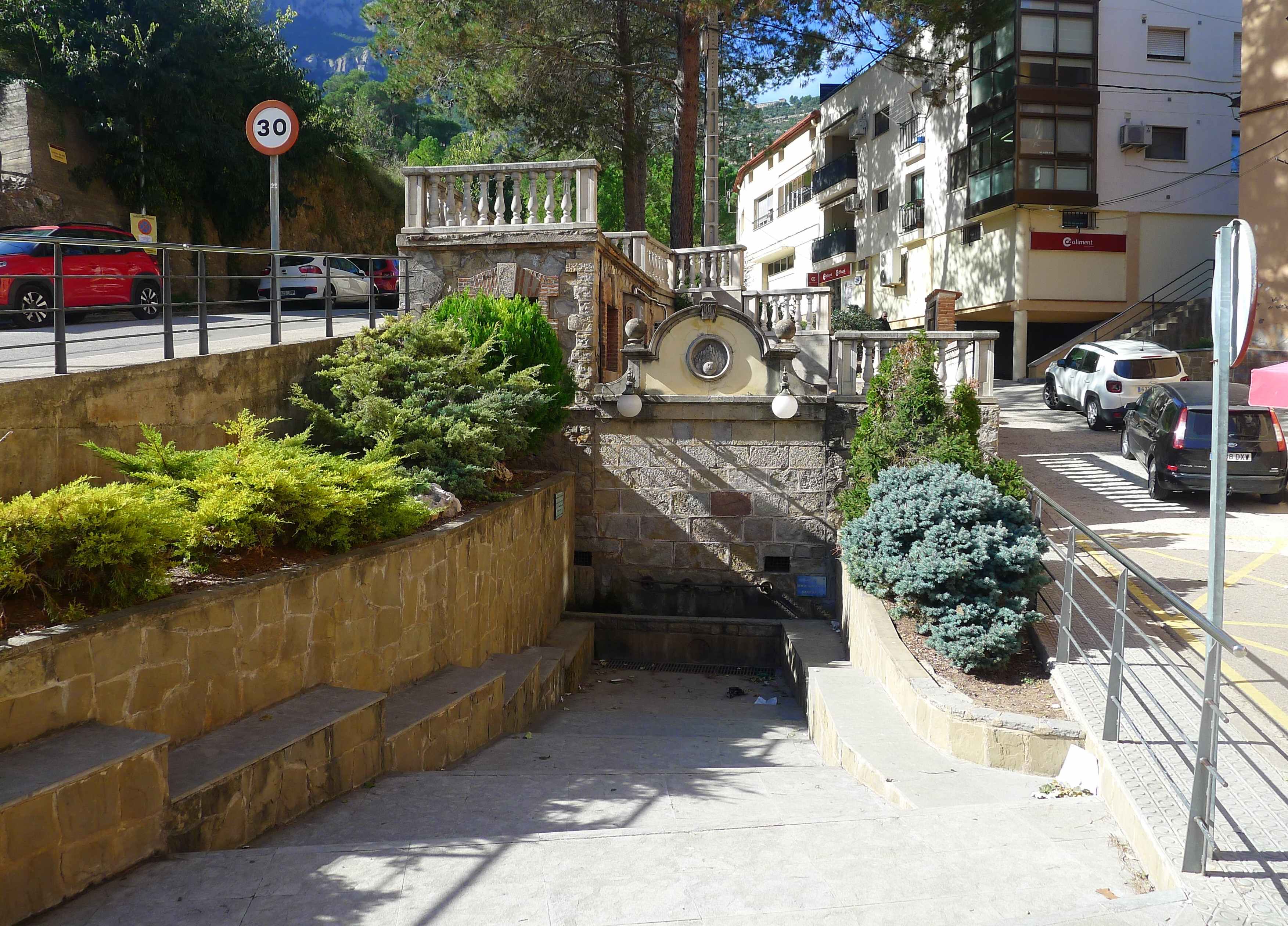 Del nucli antic de la vila, en destacarem dos carrers i dues places: el carrer de Sant Pere i el de Sant Joan i les places del Bo Bo, on conflueixen els dos carrers i la plaça de la Font Gran. Comencem per aquesta, que és la plaça principal de la vila, que presideix, òbviament, una font que és, la principal surgència del sistema càrstic de Montserrat i és l’aqüífer que abasteix d’aigua la població. La font, que fins al segle XVI va ser coneguda com a font de la Resclosella, ja estava documentada al segle XIII, tot i que la forma actual, és del segle XX.