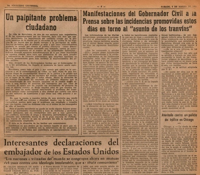 Els diaris de l’època eren controlats, la majoria, pel règim o per empreses addictes al règim, i els pocs mitjans independents no podien permetre’s fer gaires crítiques a la situació política i social. Només es permetia una lleugera crítica, molt blanca i suau, això sí, a l’esfera municipal. I és aquí on trobem una veu de l’època que ens permet veure l’animadversió creixent de la ciutadania cap al tramvia. És la ploma de Nèstor Luján a la revista Destino, on signava una secció titulada Al doblar la esquina. En un article publicat l’1 de març de 1947 deia Luján: “Pedimos perdón por tocar una vez más el asunto de la Compañía de Tranvías. Nos habíamos prometido no hablar más de él. Nuestra carta al señor alcalde publicada hace unas semanas expresaba nuestro último argumento a favor de la ciudad: apelar a su persona, tan distinguida, tan fiel a sus principios y a la vez tan amable haciendo el último llamamiento a favor de nuestra ciudad. Pero nos tememos que el señor alcalde no apreció concretamente el concepto y la forma de nuestra epístola”.