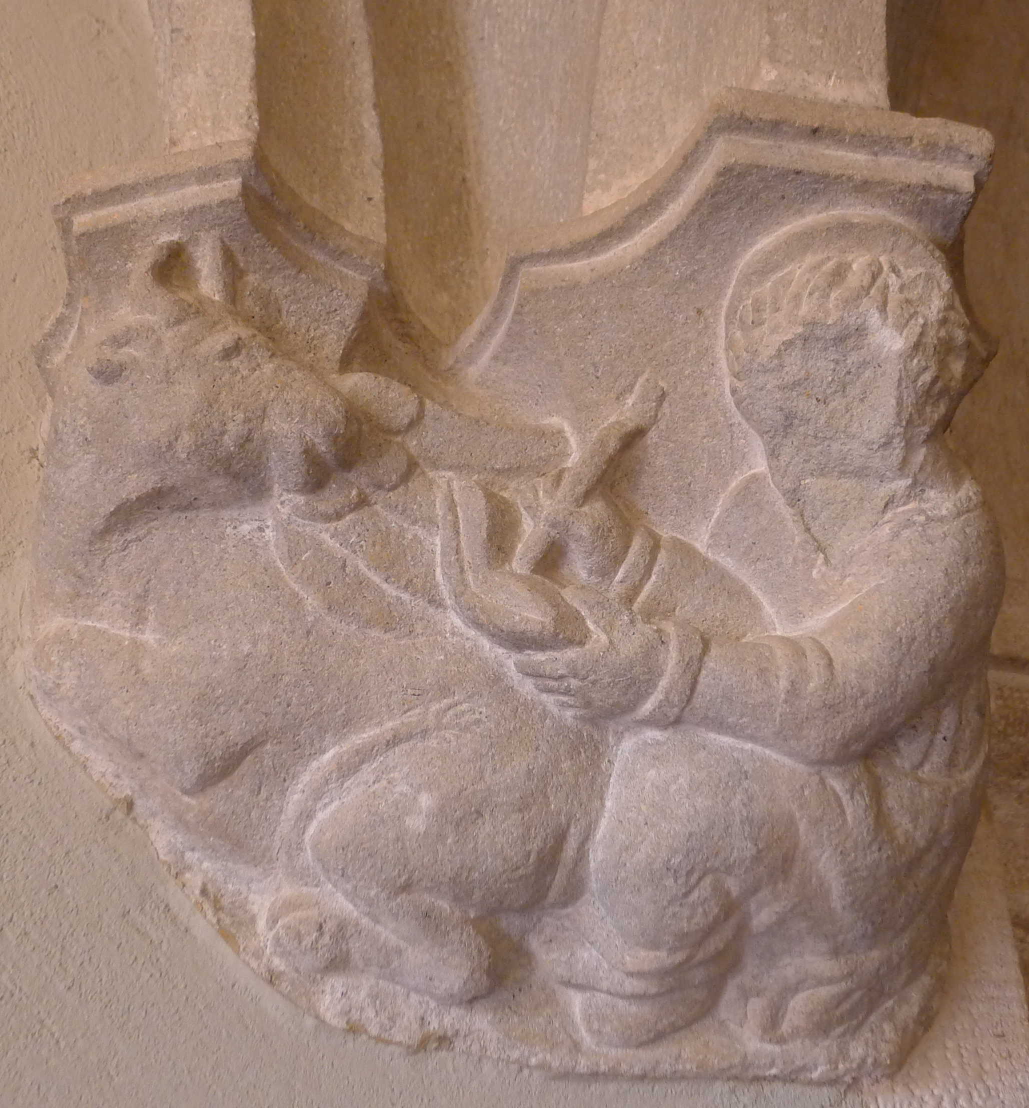 A la planta baixa, un estret passadís en forma d’embut ensporta cap un patí interior, des d’on s’accedeix a l’església, on hi podem veure les pintures de 1812 de Francisco Rodríguez i els grafits dels brigadistes internacionals que hi van estar presos durant la guerra civil. A tocar de la porta de l’església hi ha quatre mènsules que representen els quatre evangelistes.
