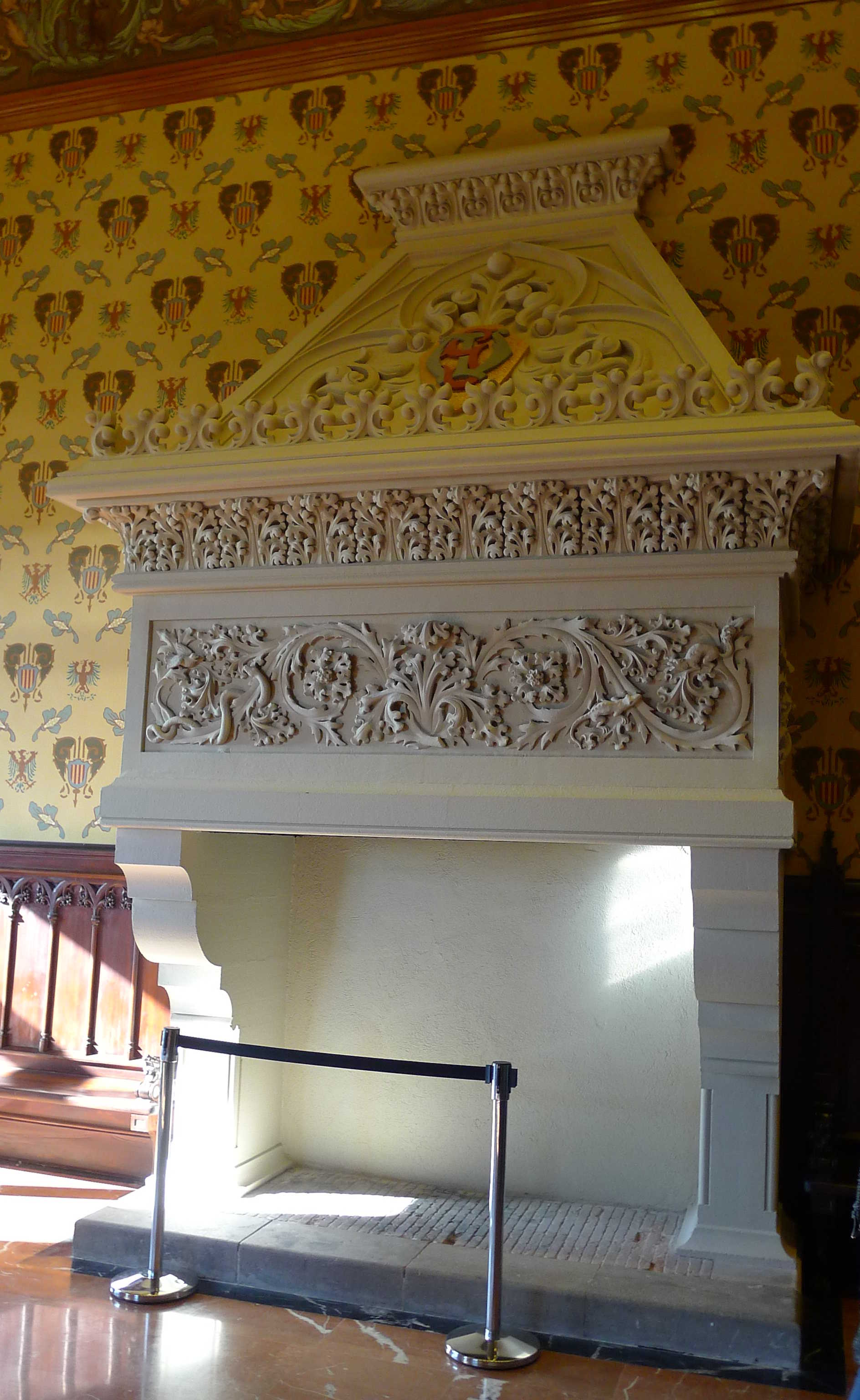 La sala d’esgrima també està decorada. A la part de baix hi ha reproduïdes escenes de gravats de llibres del segle XVII, i a la part superior hi ha uns grans medallons amb diverses escenes al seu interior, a sota de cada medalló hi ha una llegenda diferent i, entre medalló i medalló hi ha un bust d’un emperador romà sobre un pilar. Tot això és pintat.